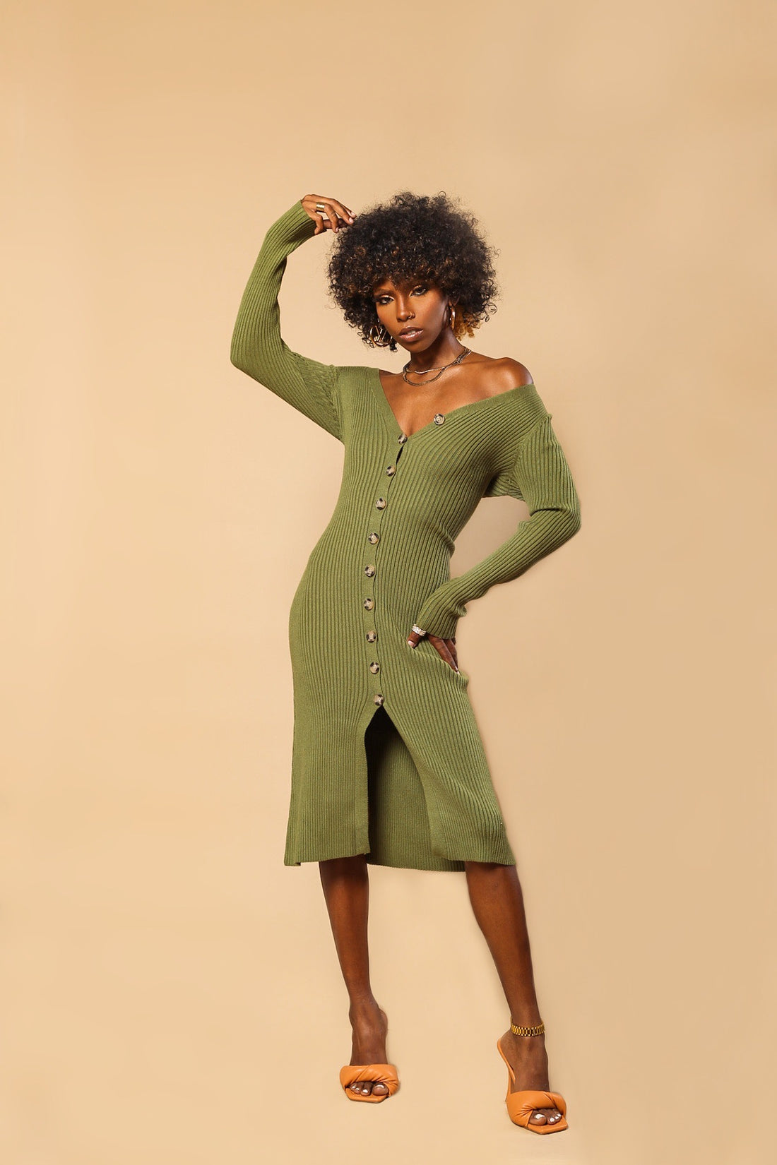 The Olivia RIBBED KNIT BUTTON UP MIDI DRESS