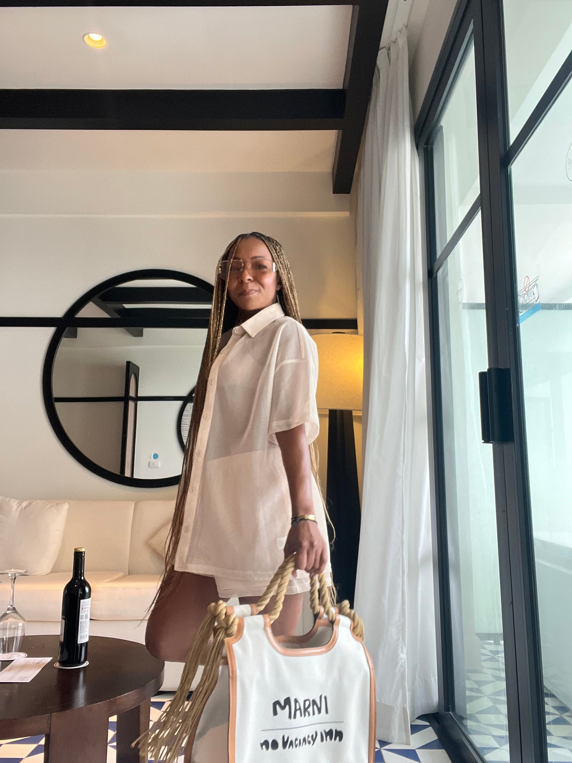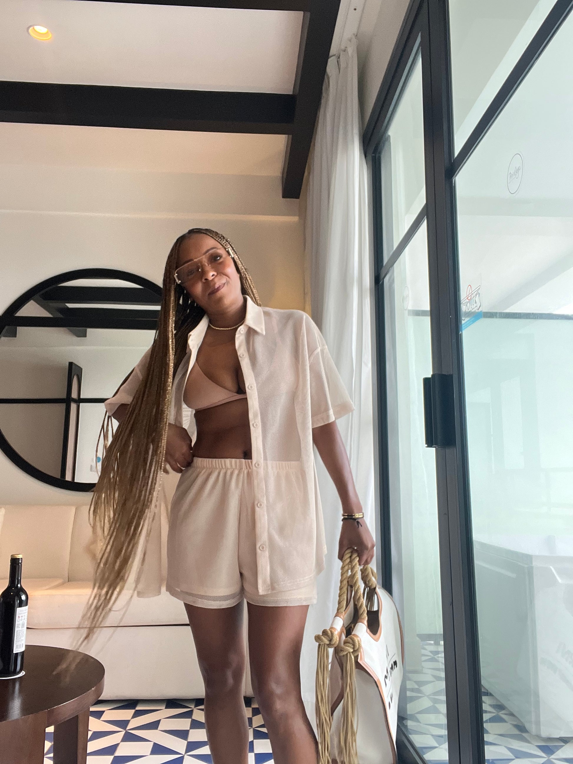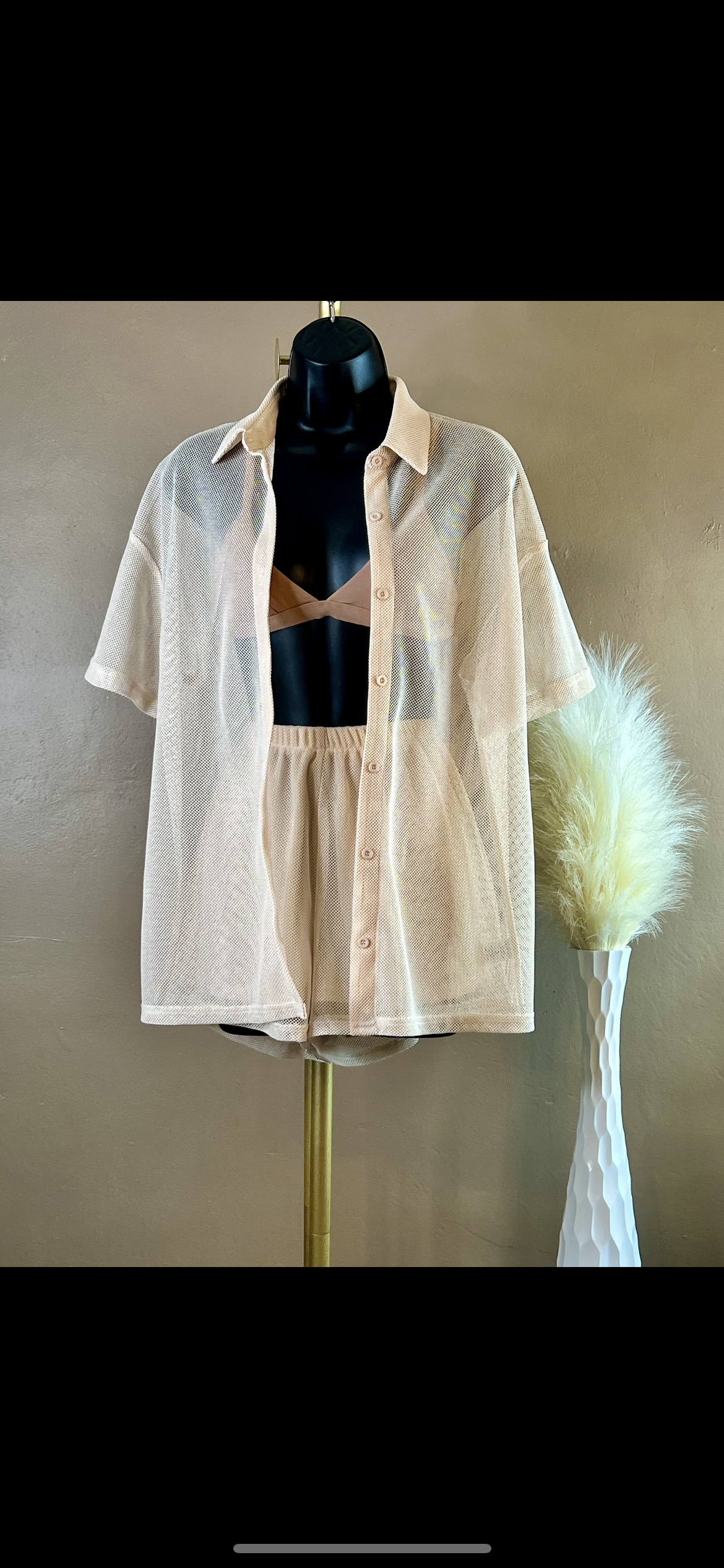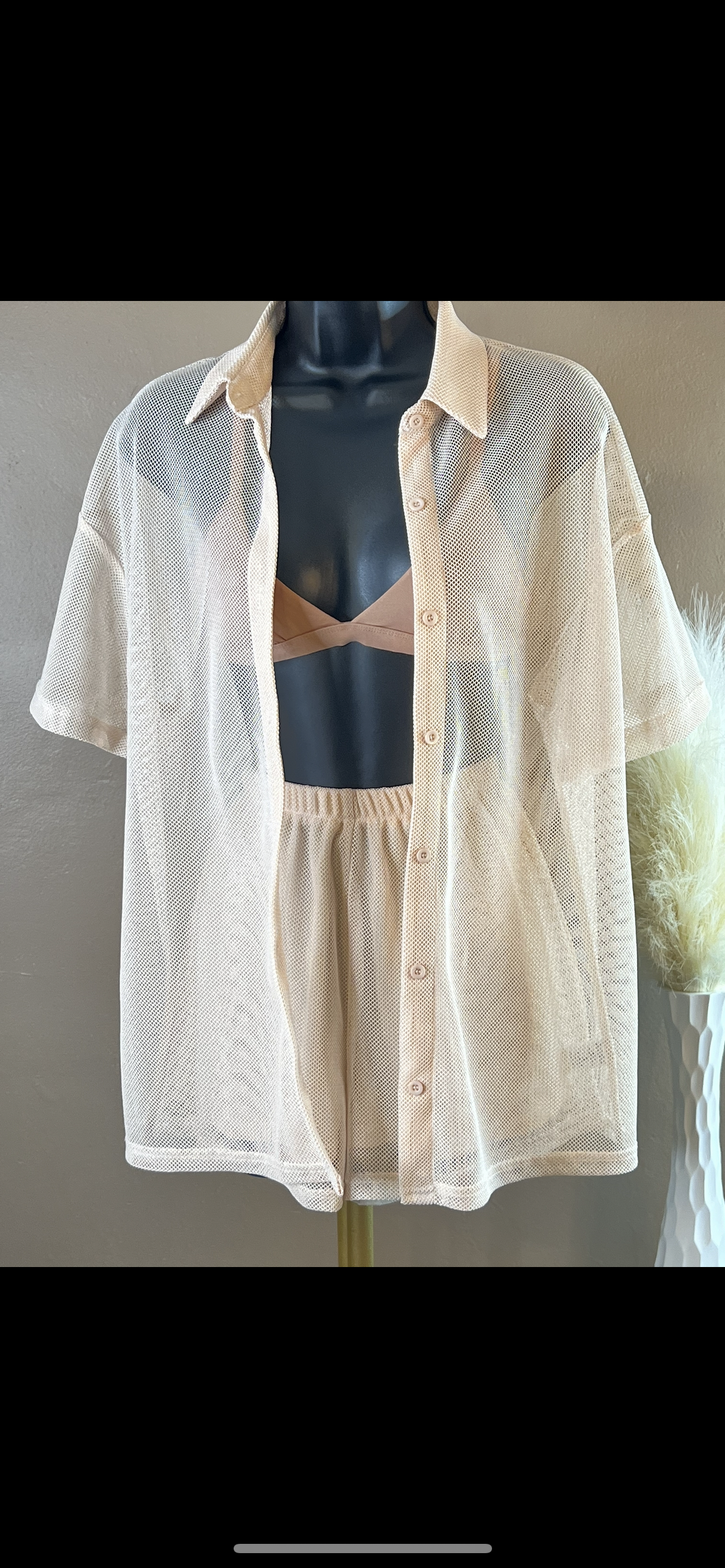 Top- Buttons on the top (can be worn open or closed and is see through) knit with metallic fabric.
