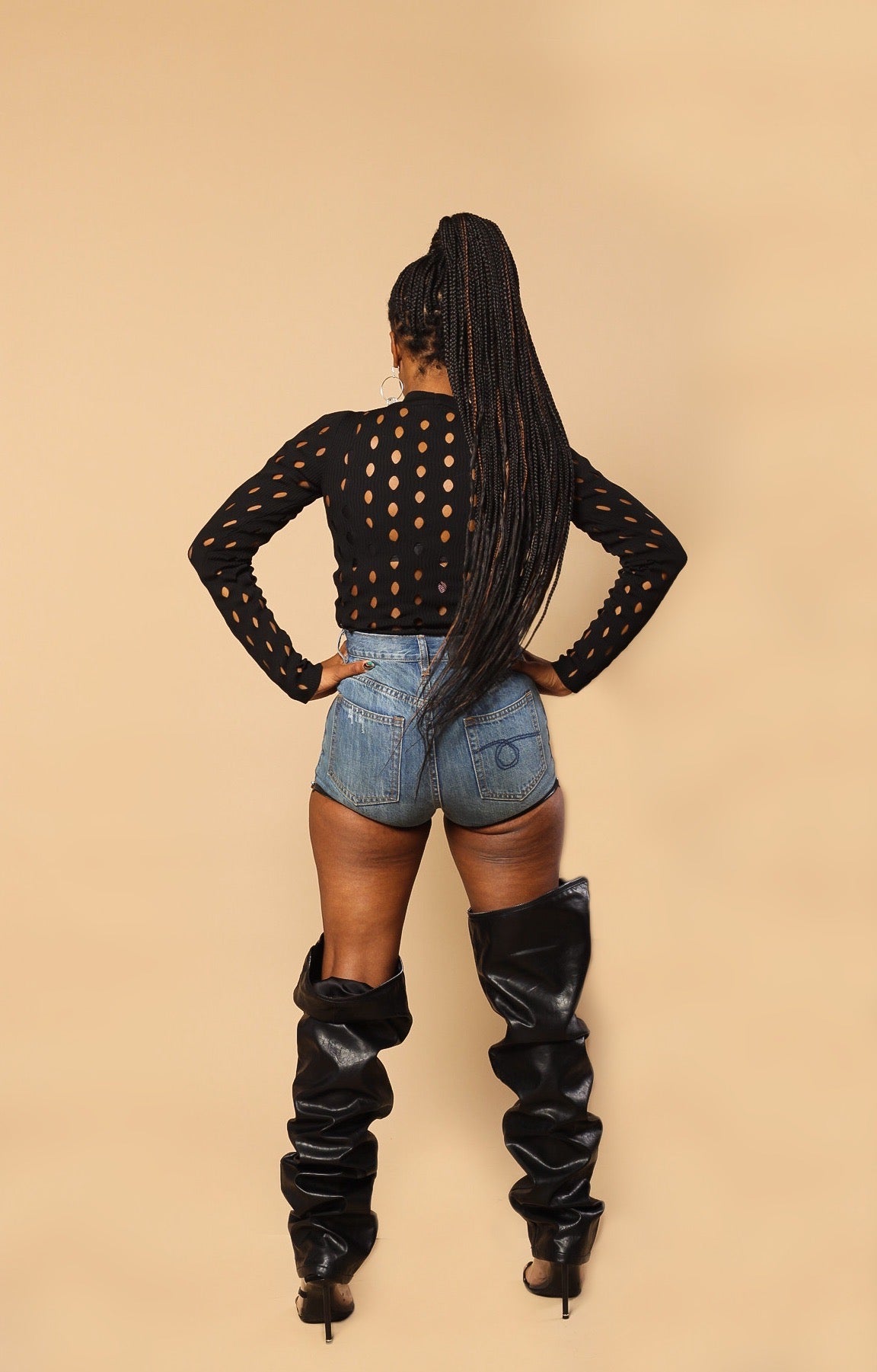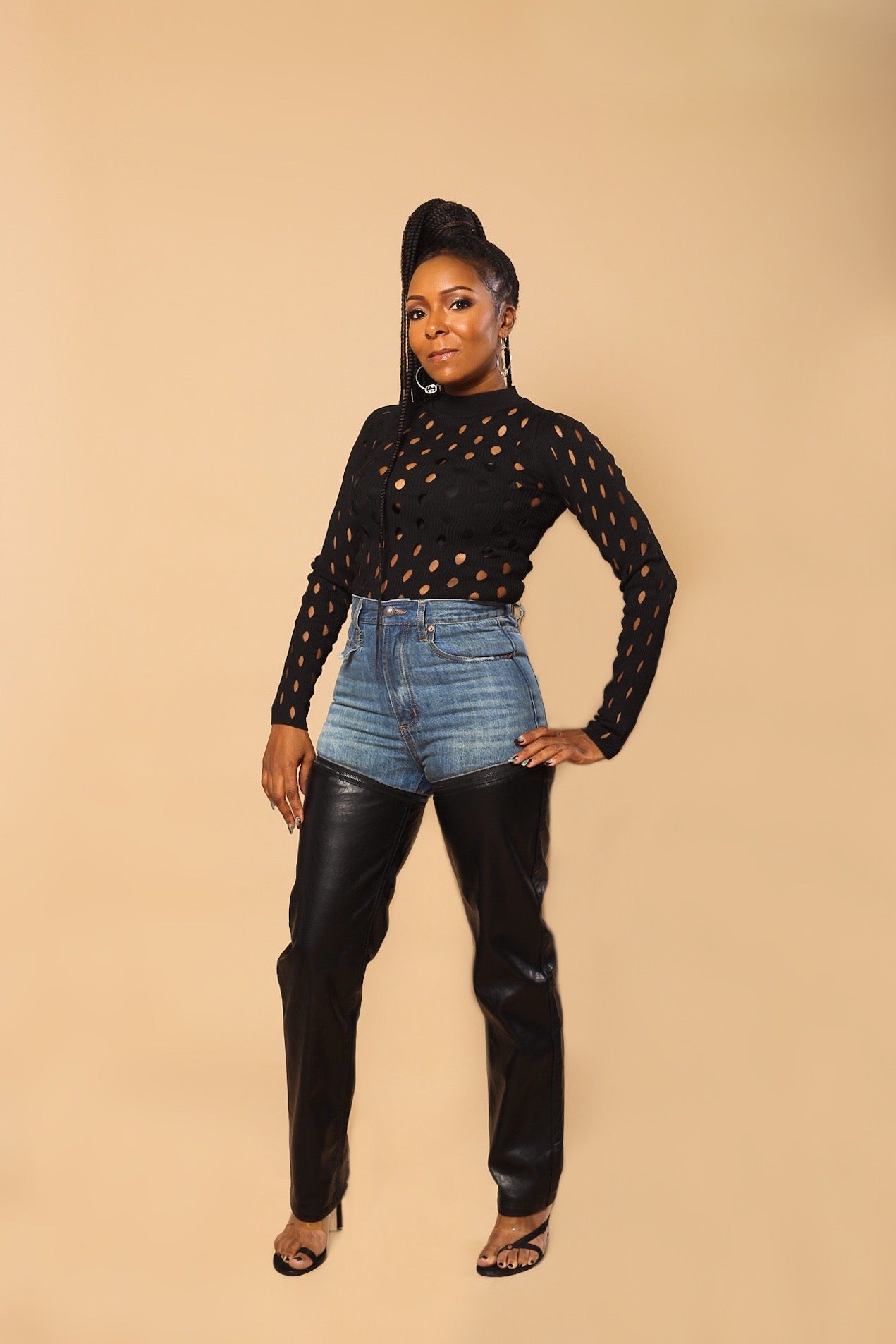 These high-rise straight leg jeans are designed with vegan leather contrast legs. Can be zipped off completely into shorts.