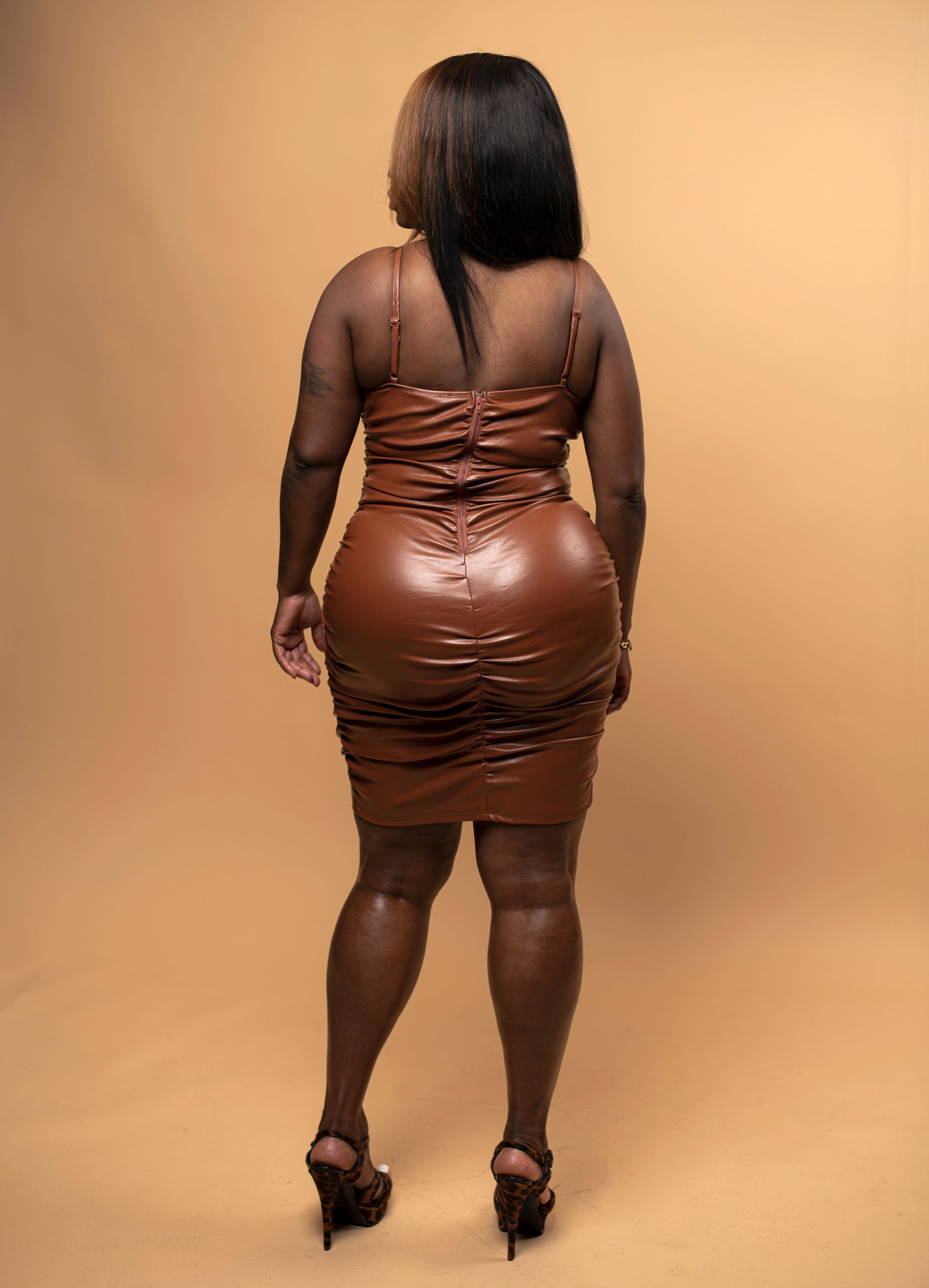 Stretchy faux leather accentuates your curves in a figure-hugging midi dress that will make a statement all on its own. Can be worn alone or with a long sleeve fitted top underneath.